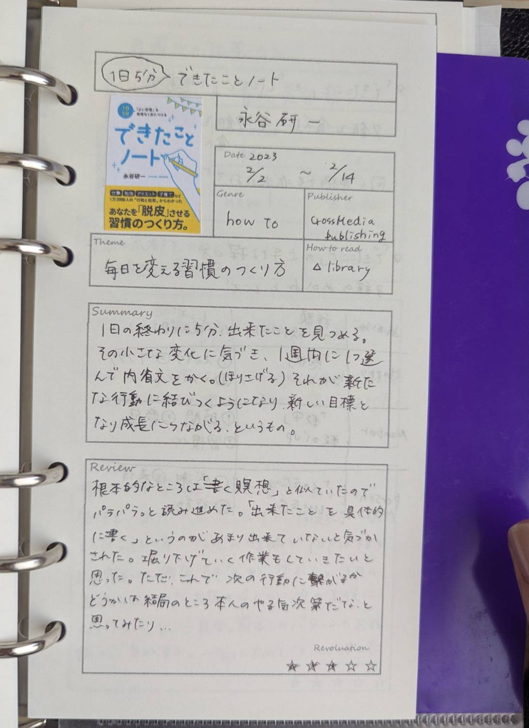 読書も似た感じで、読んだ日、ジャンル、何で読んだ(購入、Kindle、図書館で借りた・・・)と真ん中には要約、下には感想