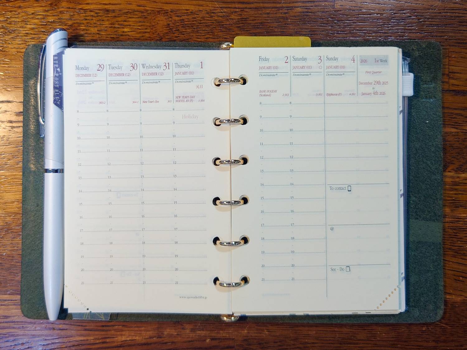 1日の行動計画を立てるためにクオバディスのバーチカル(ミニ6サイズ)を使っています。バインダーはPlotter。日曜日の夜に翌週の計画を立てます。