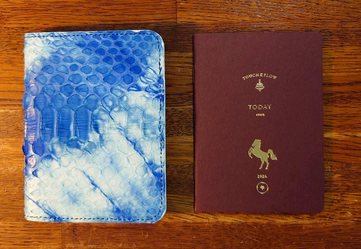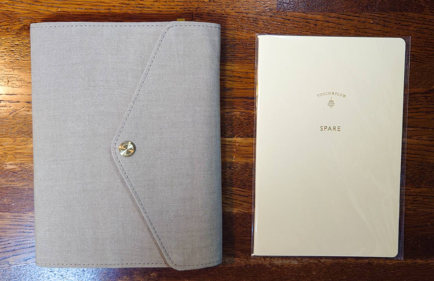 Touch&Flowのマンスリーと無罫のノート(備忘メモ)を2冊差しにし,自作カバーで使います。カバーは更新予定ですが材料費をどこまで出すかで悩み中。