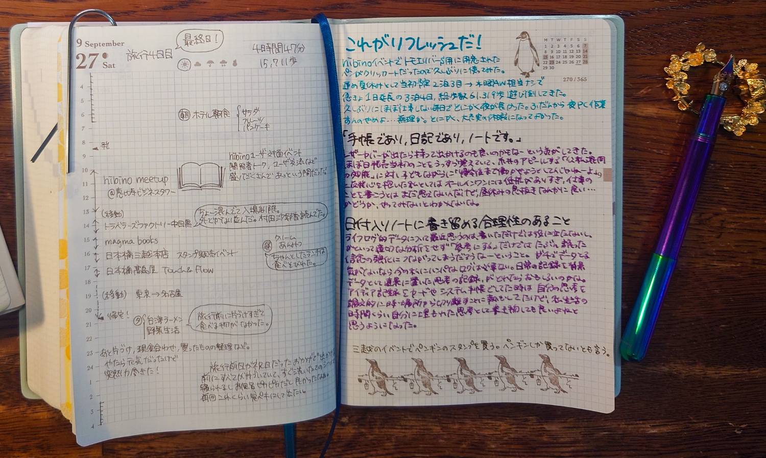 生活の管理に「日の長さを感じる手帳(B6・バーチカル)」を使っていたのですが,5月頃から段階的に「hibino(A6・1日見開き1ページ)」に移行しました。長年,生活記録にはバーチカルを使うことで,睡眠時間の確保や仕事時間の管理がしやすいのでは?と考えてきたのですが,「生活改善をしなければならない」という強迫観念がかえって健康に悪い気がしてきてやめました。ライフログ的な内容は,「特に目的はないがとりあえずメモしておく」程度が,私にはちょうど良いのかもしれません。