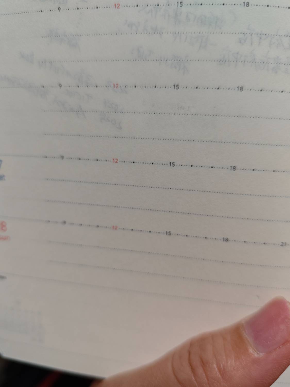 時間メモリが左ページ全ての行に設定されているのでこんな書き方ができる。見づらいかもしれないが、各日1行目に数字の入った時間軸。2行目3行目には丸点の大きさで時間がわかるようになっている。