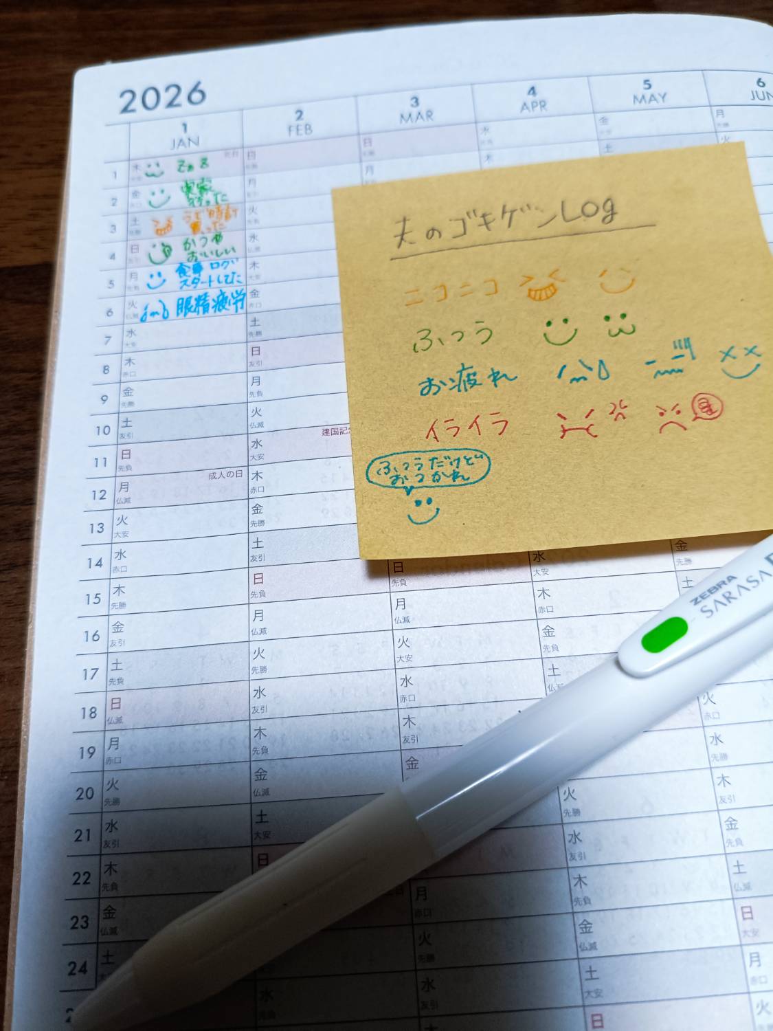 1/6は「目が痛い〜」とお疲れムードなので、青色で【😢眼精疲労】と書きました。