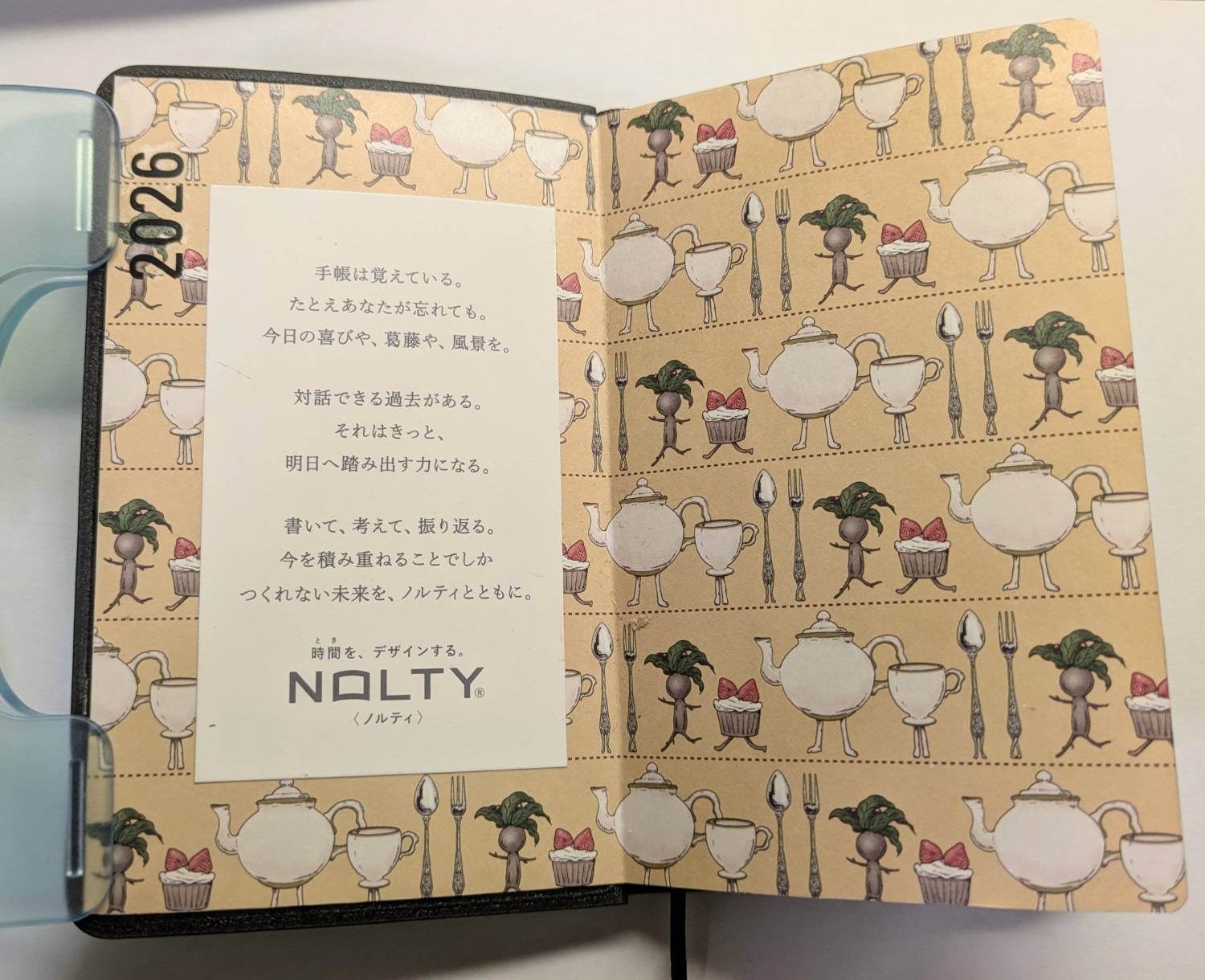 はい、見返しページにデザインペーパーと手帳に付属のメッセージカード?を貼り付けています。